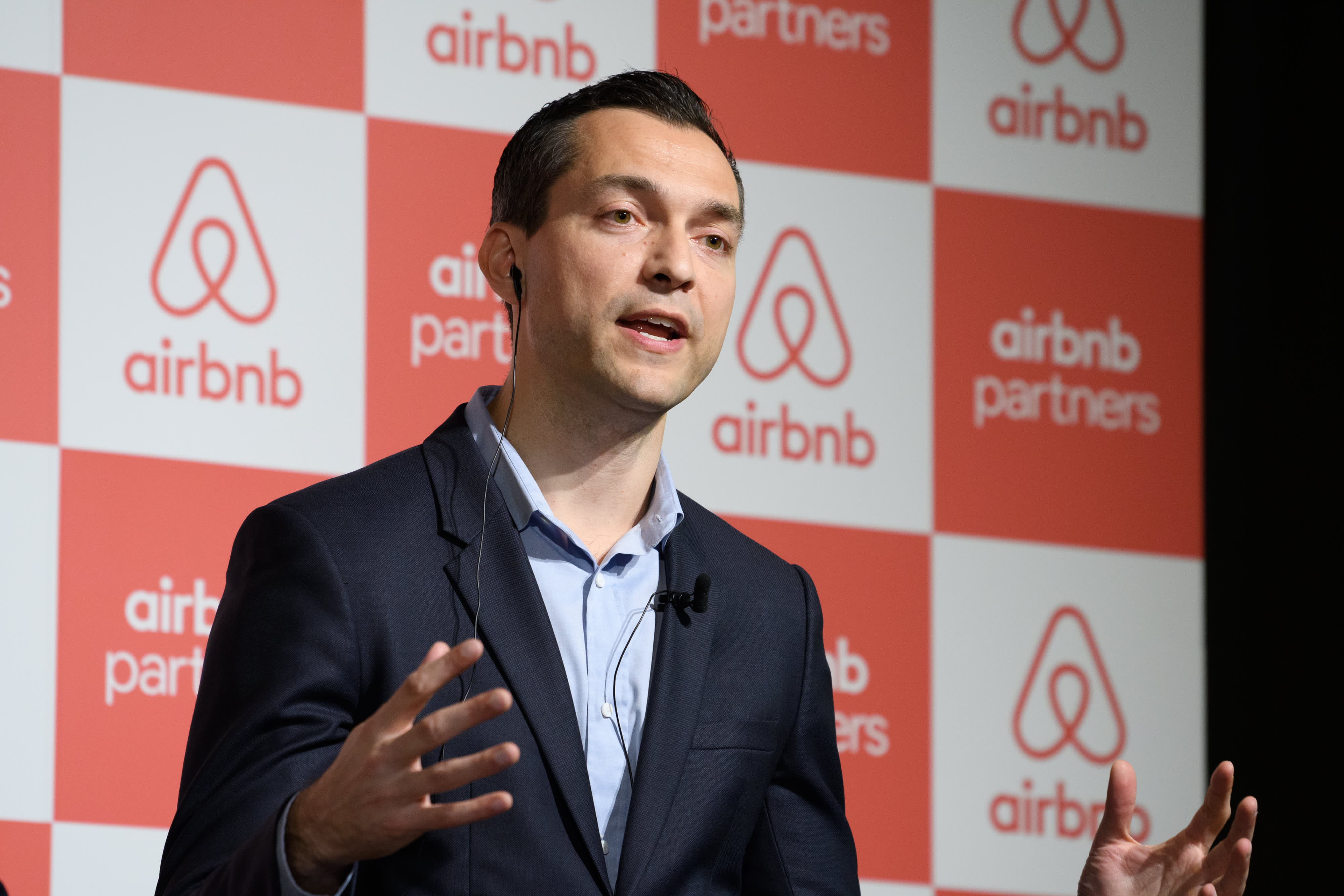 Nathan Blecharczyk, co-founder and chief strategy officer of Airbnb Inc., speaks during a news conference in Tokyo, Japan, on Thursday, June 6, 2019.