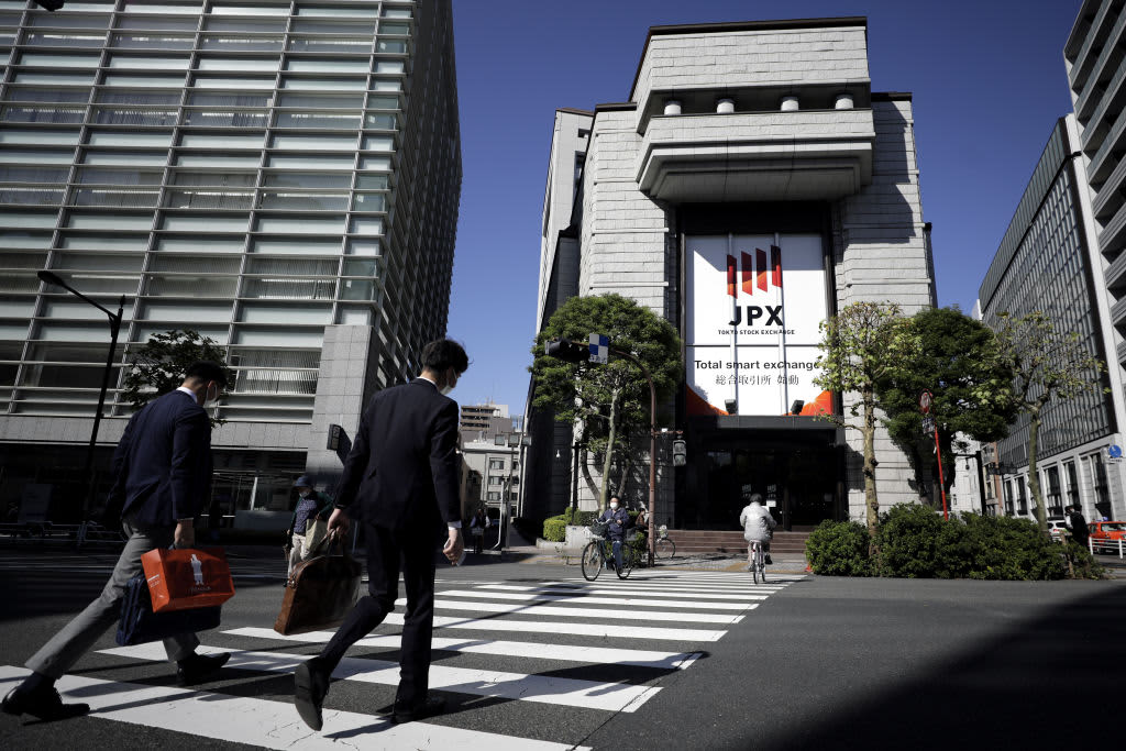 Pedestrians cross a road in front of the Tokyo Stock Exchange (TSE), operated by Japan Exchange Group Inc. (JPX), in Tokyo, Japan, on Thursday, Oct. 29, 2020.