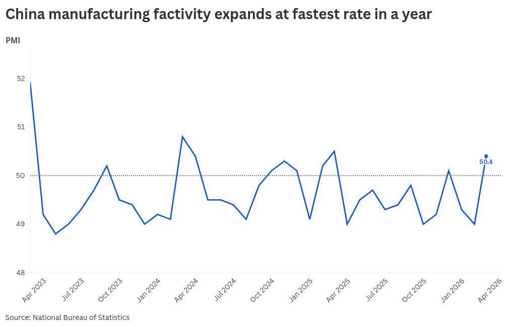 That expansion marked a notable rebound after two months of contraction, with the official figure standing at 49.3 and 49.0 in January and February, respectively. In March last year, the reading was 50.5.
