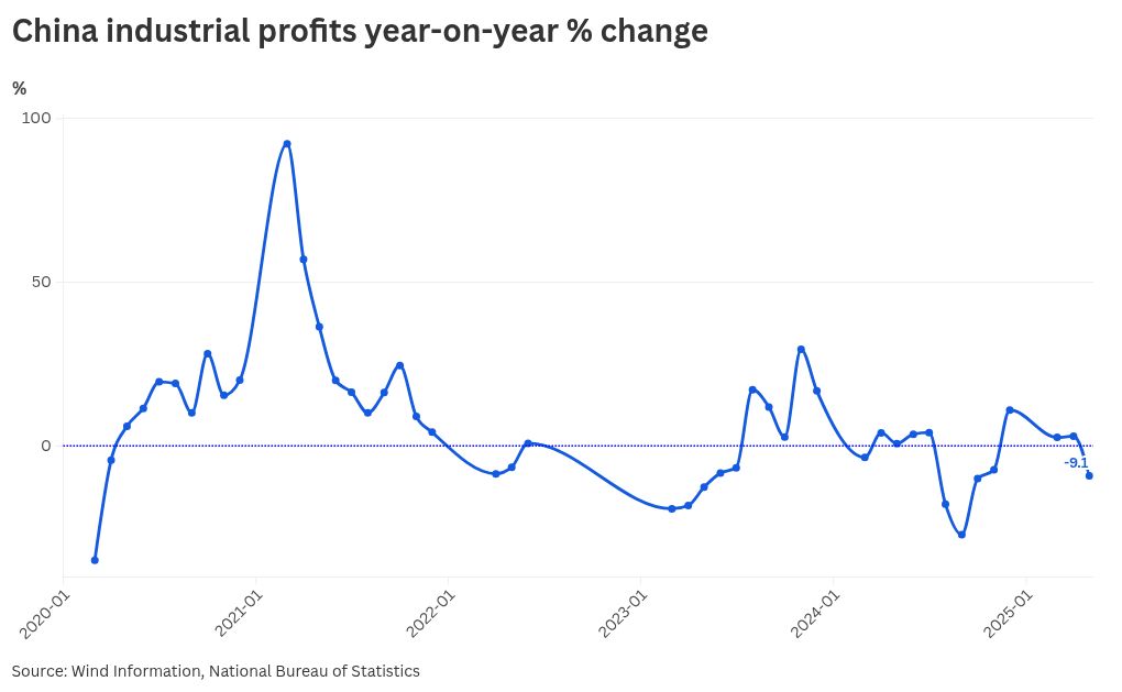 China’s industrial profits plunged 9.1% in May from a year earlier, in the latest sign that Beijing’s stimulus efforts are falling short in boosting enterprises’ profitability.