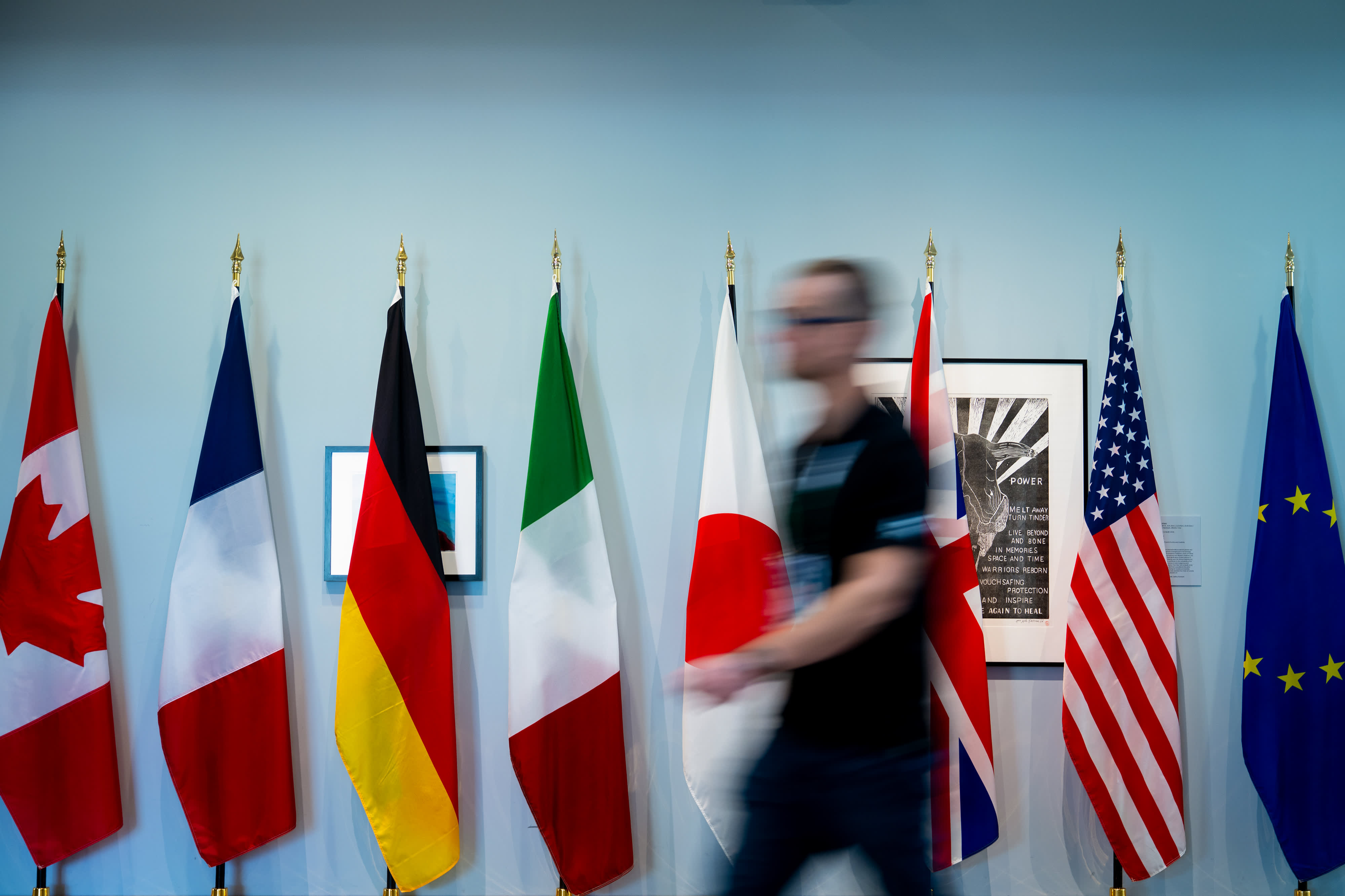 The flags of Canada, France, Germany, Italy, Japan, the United Kingdom, the United States, and the European Union ahead of the Group of Seven (G-7) Leaders’ Summit in Banff, Alberta, Canada, on Saturday, June 14, 2025.