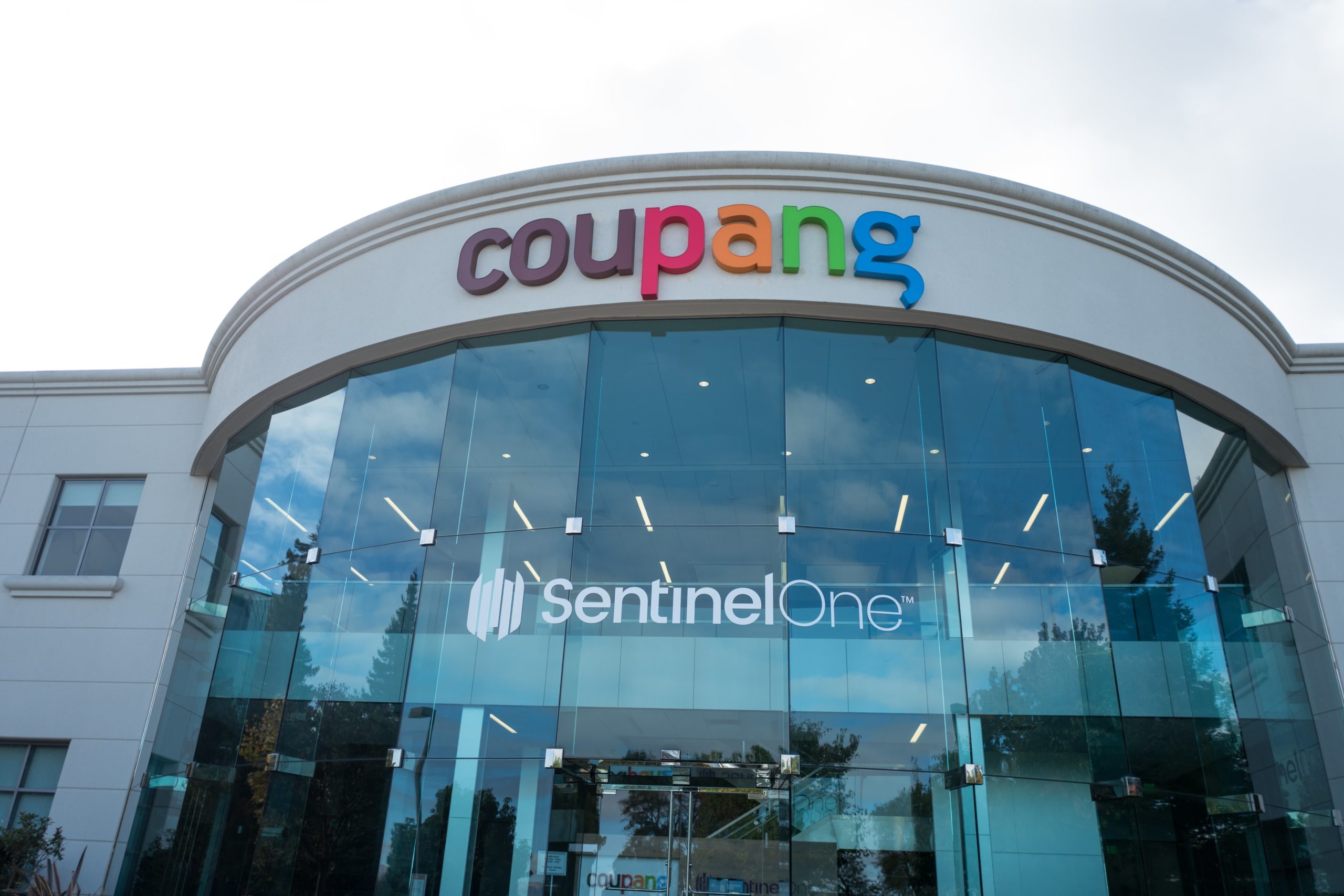 Logos on facade at the shared headquarters of Internet company Coupang and security company SentinelOne in the Silicon Valley town of Mountain View, California, October 28, 2018.