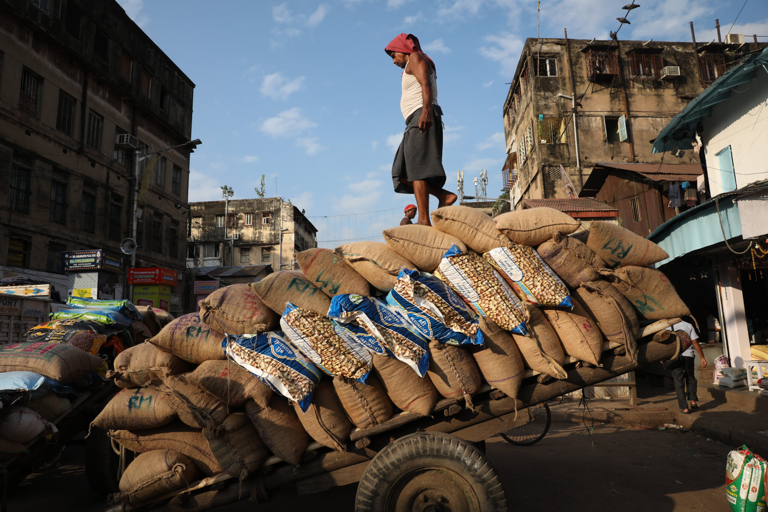 A laborer loads consumer goods onto a supply cart at a wholesale market in Kolkata, India, on November 11, 2024.