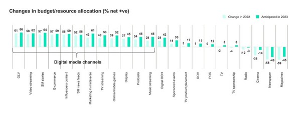 Digital media spend is expected to continue increasing in 2023. Online video, video streaming and social media stories are the top 3 channels with a net increase in budget allocation in 2022 and 2023, followed by marketing in the metaverse, which marketers say they will increase by 61% in 2023.
