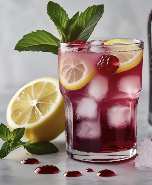 Shake the PGI Syracuse Lemon juice with raspberry syrup and a few mint leaves in a shaker (gently muddle the mint beforehand). Fill the glass with crushed ice, pour the shaken mix, and top with soda or sparkling water. Garnish with a thin slice of PGI Syracuse Lemon (with peel), a sprig of rosemary, and a few raspberries.