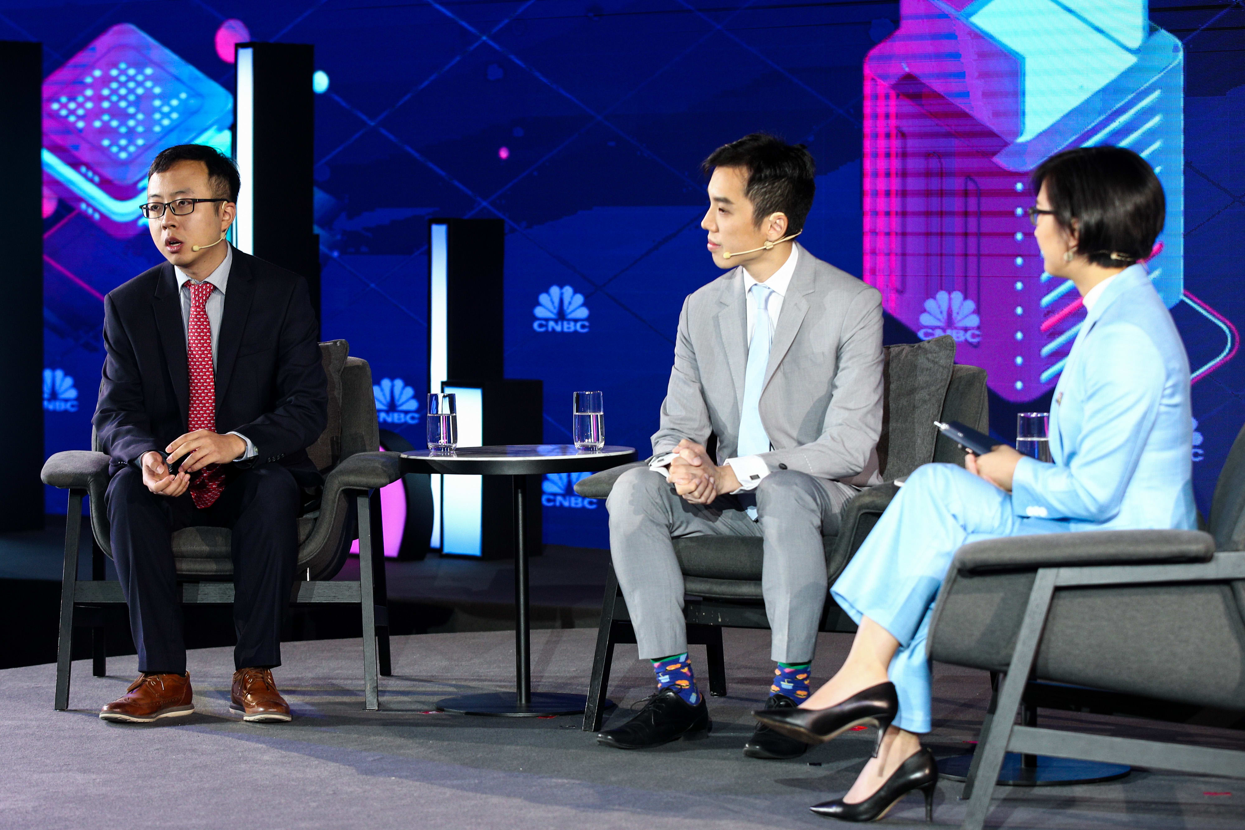 (L-R) Hongye Wang, partner of Antler; Eric Lin, head of research at UBS Securities in China; and Evelyn Cheng of CNBC on the first day of CNBC’s East Tech West conference in Nansha, Guangzhou on Nov. 17, 2020.